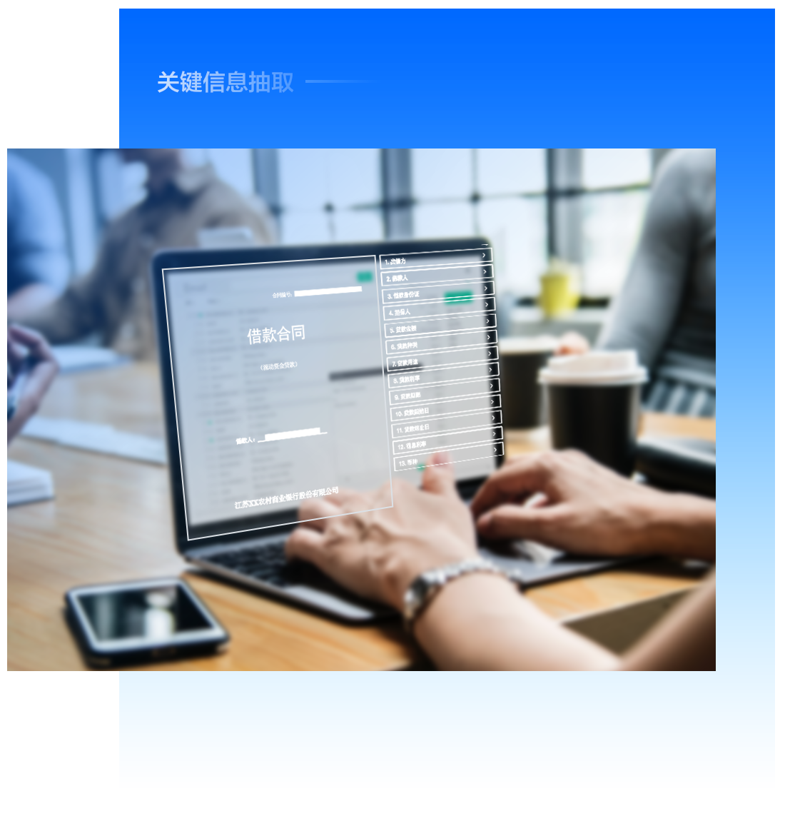 针对金融行业常见处理文档、结合信息披露、条款审核等业务需求,实现人物、事件、组织、数值、条款等各类关键信息抽取